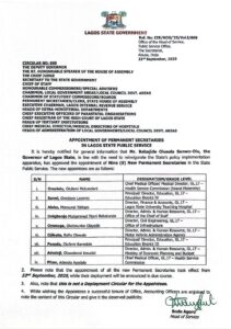 The appointments were announced in a circular signed by the Head of Service, Mr. Bode Agoro, dated September 23, 2025 (Ref No. CIR/HOS/’25/Vol.I/069). According to the document, Governor Babajide Sanwo-Olu approved the new appointments to “reinvigorate the State’s policy implementation apparatus” and improve public service delivery.