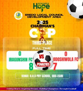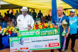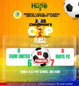 Youth and sports development, often the heartbeat of any progressive society, found expression in the grand finale of the second edition of the Eredo LCDA Chairman’s Cup. The thrilling encounter between Iraye FC and defending champions Egiri FC delivered not just football drama but community bonding. After a tense goalless draw and a nerve-racking penalty shootout that extended to the goalkeepers, Iraye FC emerged victorious. The prize money: ₦1.5 million for the champions, ₦800,000 for the first runners-up (Odo-Egiri FC) and ₦500,000 for the second runners-up (Iragunshin FC), was more than reward; it was investment in talent, teamwork and dreams.