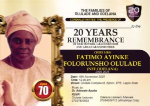 In Yoruba culture, the bond between a mother and her children is a sacred cord; elastic enough to stretch beyond time, yet strong enough to anchor generations. It is this eternal affinity that the Olulade and Odelana families prepare to honour as they mark twenty poignant years since the passing of their matriarch, Chief Mrs. Fatimo Ayinke Folorunsho Olulade (née Odelana); a woman whose memory has grown into a legacy, and whose legacy has become an inheritance.