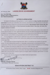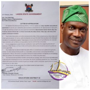 In a letter dated February 18, 2026, the district praised the lawmaker’s far-reaching interventions in key institutions including Epe Grammar Senior School, Epe Grammar Junior School and Temu Community Secondary School, Temu, describing his efforts as transformative and deeply impactful.
