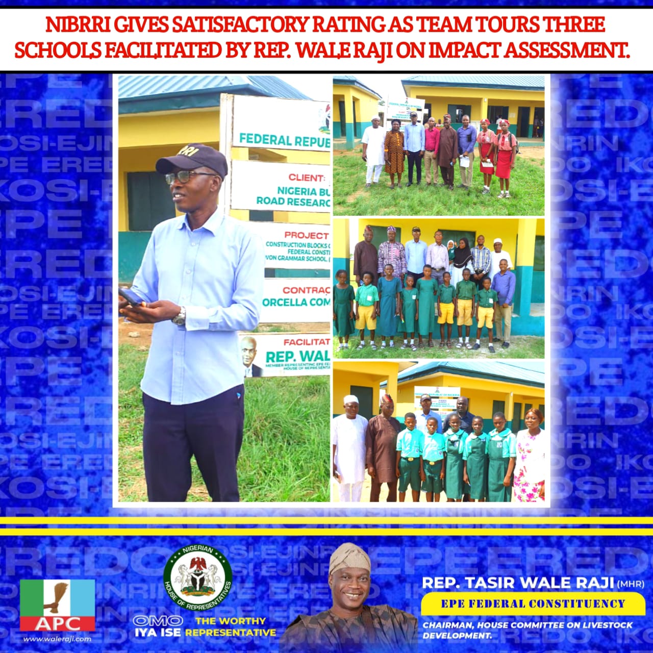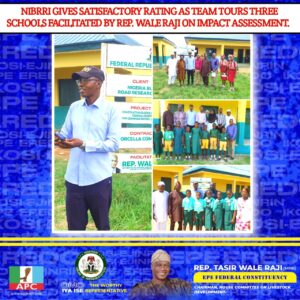 The Nigeria Building and Road Research Institute (NIBRRI) has given a satisfactory rating to the school projects facilitated by Rep. Wale Raji, Member of the House of Representatives for Epe Federal Constituency, Lagos State, following an impact assessment tour of selected schools on Monday, October 20, 2025.